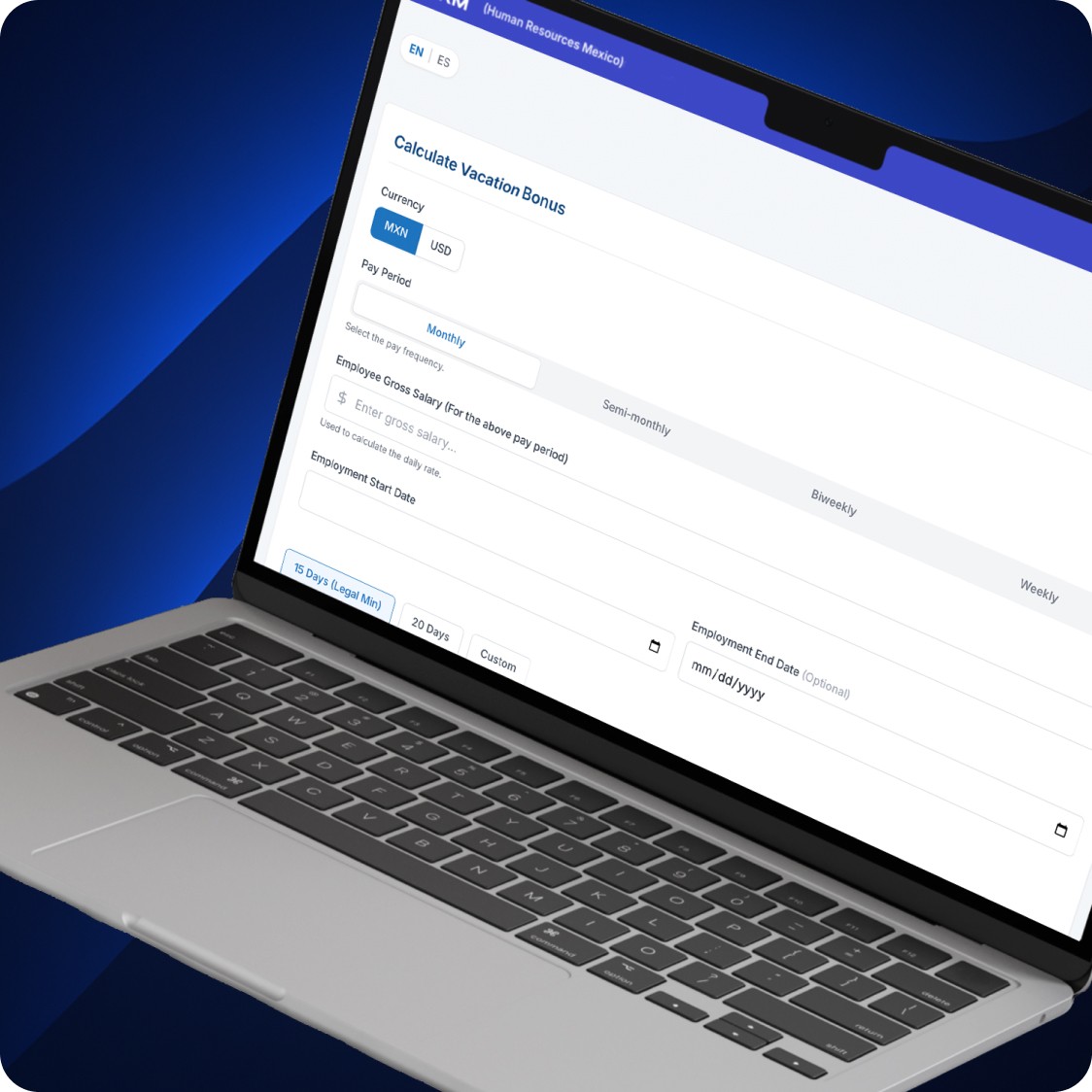 Test different salary scenarios and calculate the vacation bonus in real time.